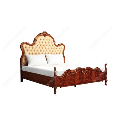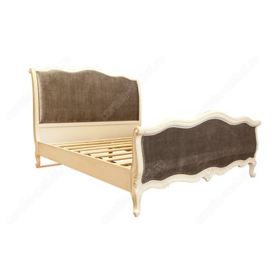 Кровать с высокой спинкой, изогнутой к боковинам, украшена крупными декоративными медальонами с посеребренными завитками. Игру цвета и текстуру кровати усиливает блеск страз обивки капитони.