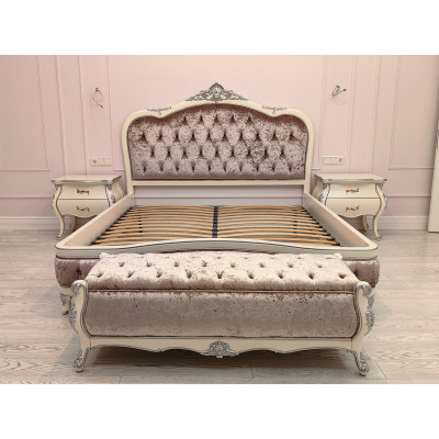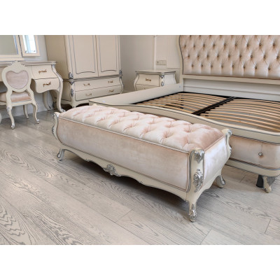 Банкетка обтянута муаровым велюром. При различном освещении муаровый велюр меняет цветовую гамму от белого до светло-розового. Стяжки капитоне (каретная стяжка) выполнены с использованием прозрачных страз. Банкетка изготовлена из массива бука и украшена по технологии серебрения.