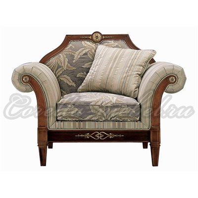 Кресло выполнено из массива красного дерева. Мебель получила более десятка международных сертификатов качества и сертификат безопасности используемых материалов. Мягкая мебель может быть изготовлена на заказ в одной из 140 видов тканей и одном из 18 видов кож. При заказе у нас мягкой мебели мы можем предложить вам возможность покупки такой же ткани, например для штор по себестоимости (примерно 25-40 у.е. за погонный метр ткани).
