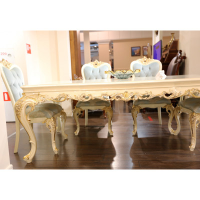 Обеденный стол рассчитан на 6-8 человек. На поверхности столешницы выполнена ручная роспись. Декоративные элементы покрыты золотым цветом. Поверхность мебели покрыта лаком.