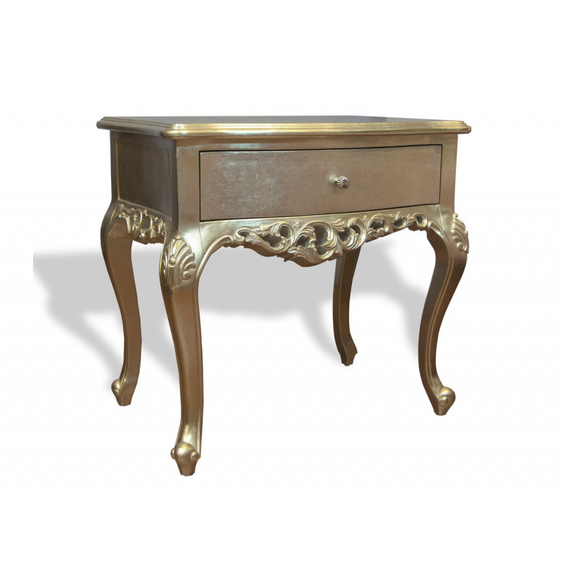 Массив бука, ручная резьба, МДФ (большие плоские поверхности). Ручное нанесение поталевых листов серебра и золота. Немецкая фурнитура на ящиках (плавные доводчики).